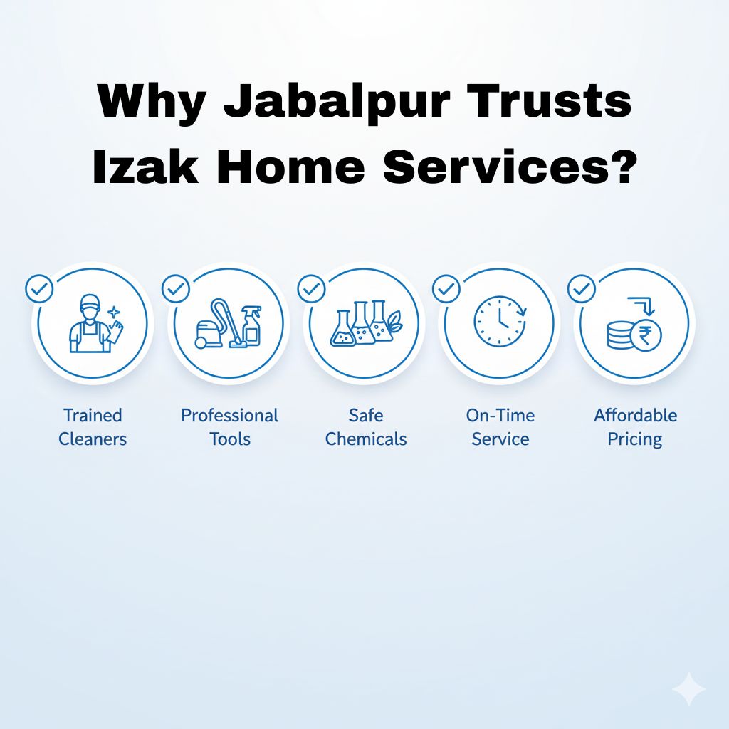 “Izak Home Services Jabalpur की trusted cleaning company है, जहाँ हम आपके घर और ऑफिस को hygienic, germ-free और sparkling clean बनाते हैं। हमारी trained और verified team professional machines और safe chemicals के साथ deep cleaning करती है।